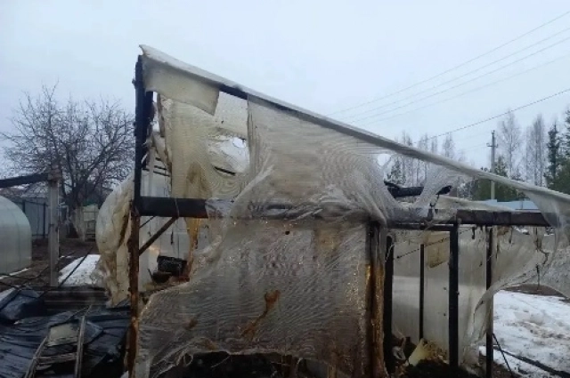 Пожар уничтожил дровяник и две теплицы, а также повредил кровлю хлева и сайдинг дома на площади 41 квадратный метр.