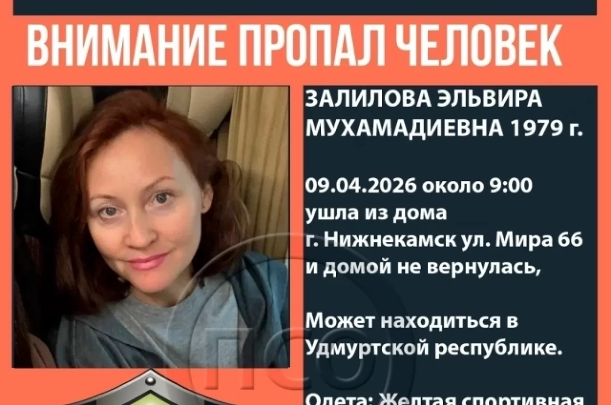Как сообщили в добровольческом поисково-спасательном отряде Ижевска, утром 9 апреля Эльвира Залилова вышла из дома, расположенного на улице Мира в Нижнекамске, и отправилась в неизвестном направлении. С тех пор женщина не возвращалась и не выходила на связь с родными и близкими.