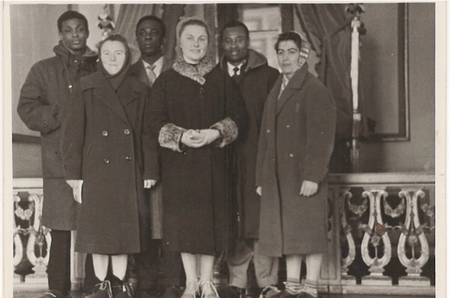 Но сохранились другие фотографии. Группы, курса, друзей. Вот три девушки: слева — Фаина Михайловна, рядом — ей подруги из Белоруссии и Грузии. И трое парней из какой-то африканской страны, которые обхаживали их, а они учили их русскому языку.